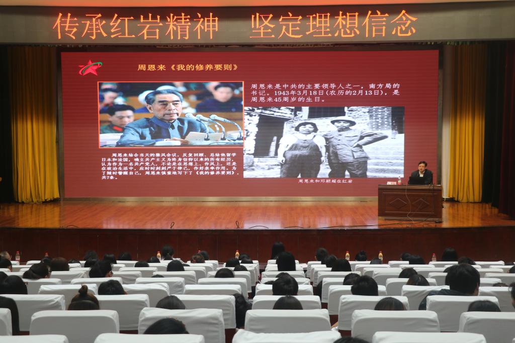 报告会上,周老师围绕红岩精神概述、红岩光辉事迹、红岩以文化人三个方面,通过一段段鲜活的史实资料,深刻阐释了红岩精神的实践来源和精神内涵。周老师以激昂真挚的情感,生动形象地讲述了老一辈无产阶级革命家毛泽东、周恩来在红岩的光辉事迹;讲述了江竹筠、王朴、张露萍等红岩烈士的感人事迹,让在场同学切实体会到了信仰的力量。最后在报告中,周老师讲到红岩精神赋予了我们当代大学生实现梦想的精神力量和无穷智慧,并勉励在场学生要学习革命先烈对生命意义的理性认识和对人生价值的正确追求。