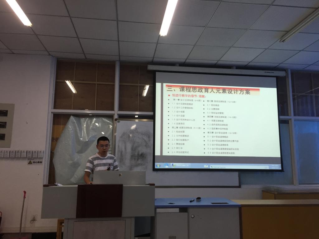 参会的其他教师也纷纷提出了自己关于“课程思政”的认识。周莉老师结合《财务报表分析》课程,把“社会主义核心价值观”、全局观、自我价值与社会价值的统一等元素融入课程教学设计。张露老师将“大局意识、法治意识、职业道德、金钱观”等思政育人元素融入到课程《期货及衍生品概论》中。张国君老师结合《会计职业道德与财经法规》课程设计,分享如何把社会主义核心价值观、会计道德伦理、工匠精神等思政育人元素融入课程教学。