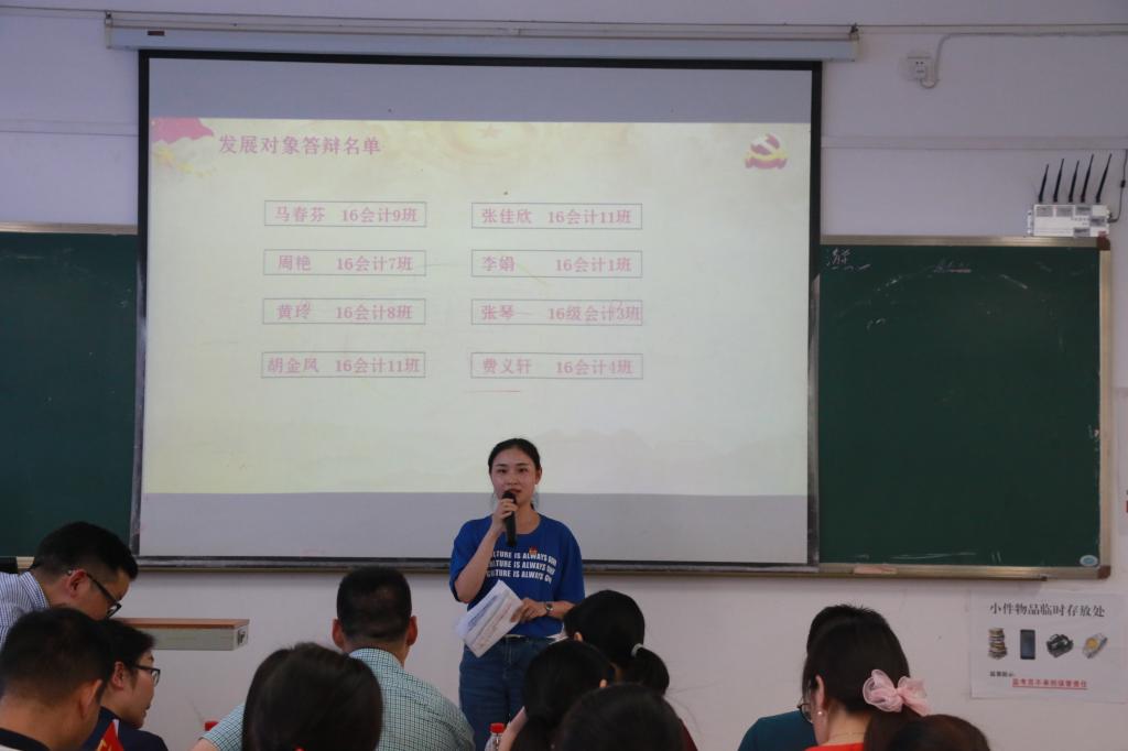 【供稿/柴胜锋】为提高党员发展质量,深入考察发展对象的入党动机、对党的基本知识和政治理论掌握情况,会计与金融学院党总支学工党支部于6月6日举行党员发展对象公开答辩会。此次答辩由支部书记柴胜锋主持,支部全体党员、8名发展对象及40余名入党积极分子代表参加,党委组织部干部黄建受邀出席。
