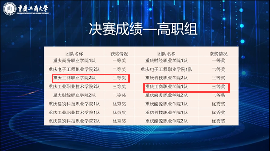 赛前,四位指导教师对选手进行了选拔和指导,六位学生积极备赛。受疫情影响,大赛由各个参赛学校自己提供比赛场所和设备,通过云端在线参加。分管副院长刘东辉高度重视,协调学院各职能部门,通力协作,为备赛团队提供了优质比赛环境与保障支持。由胡曦月、张耀文老师指导的重庆工商职业学院1队学生(吴显莉、郑涵、庹钱升)获得高职组三等奖,由刘龙峰、邓艳老师指导的重庆工商职业学院2队学生(刘瑞、王佩瑶、曾宾宜)获得高职组二等奖。