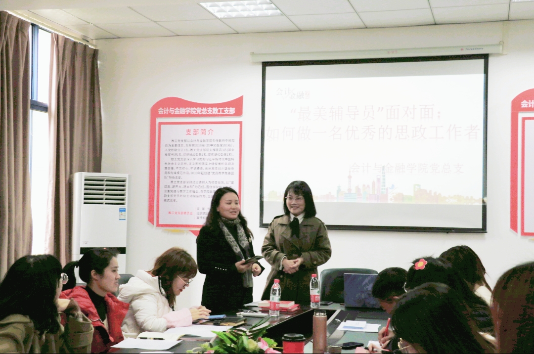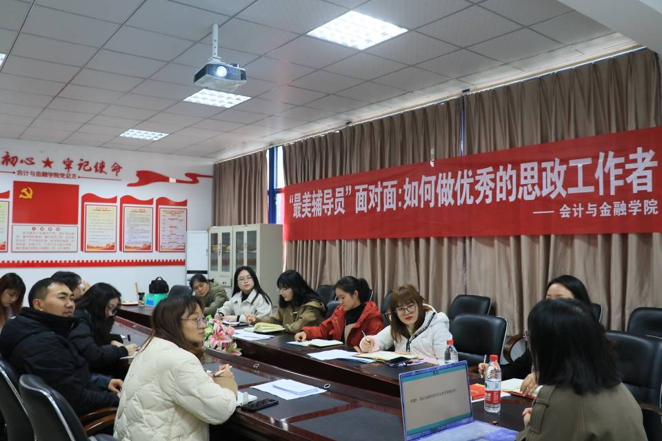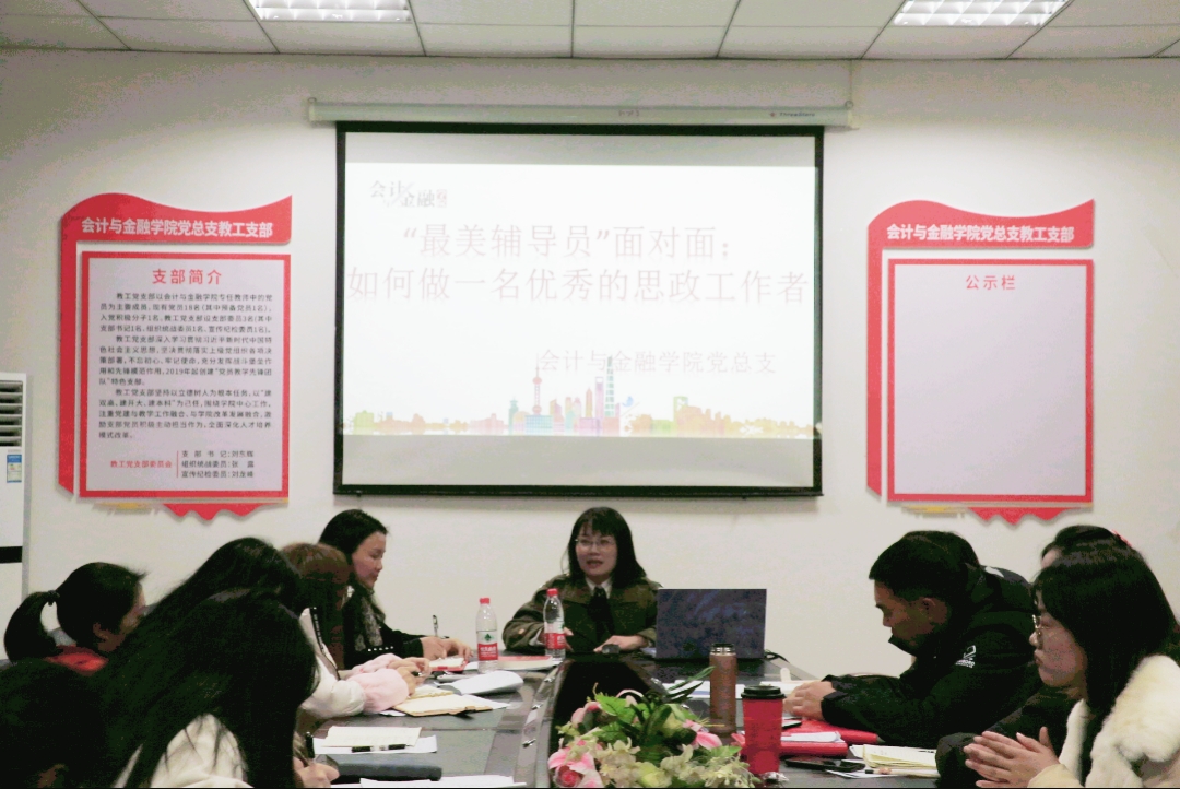 【供稿人/游海莉】12月13日下午2点,会计与金融学院在b223开展““最美辅导员”面对面:如何做一名优秀的思政工作者”座谈会,此次座谈会邀请到了重庆对外经贸学院校团委书记、“最美高校辅导员”、“重庆市高校辅导员年度人物”、“重庆市优秀辅导员”、“重庆市辅导员素质能力大赛一等奖”史丽涛老师为全体辅导员做交流。