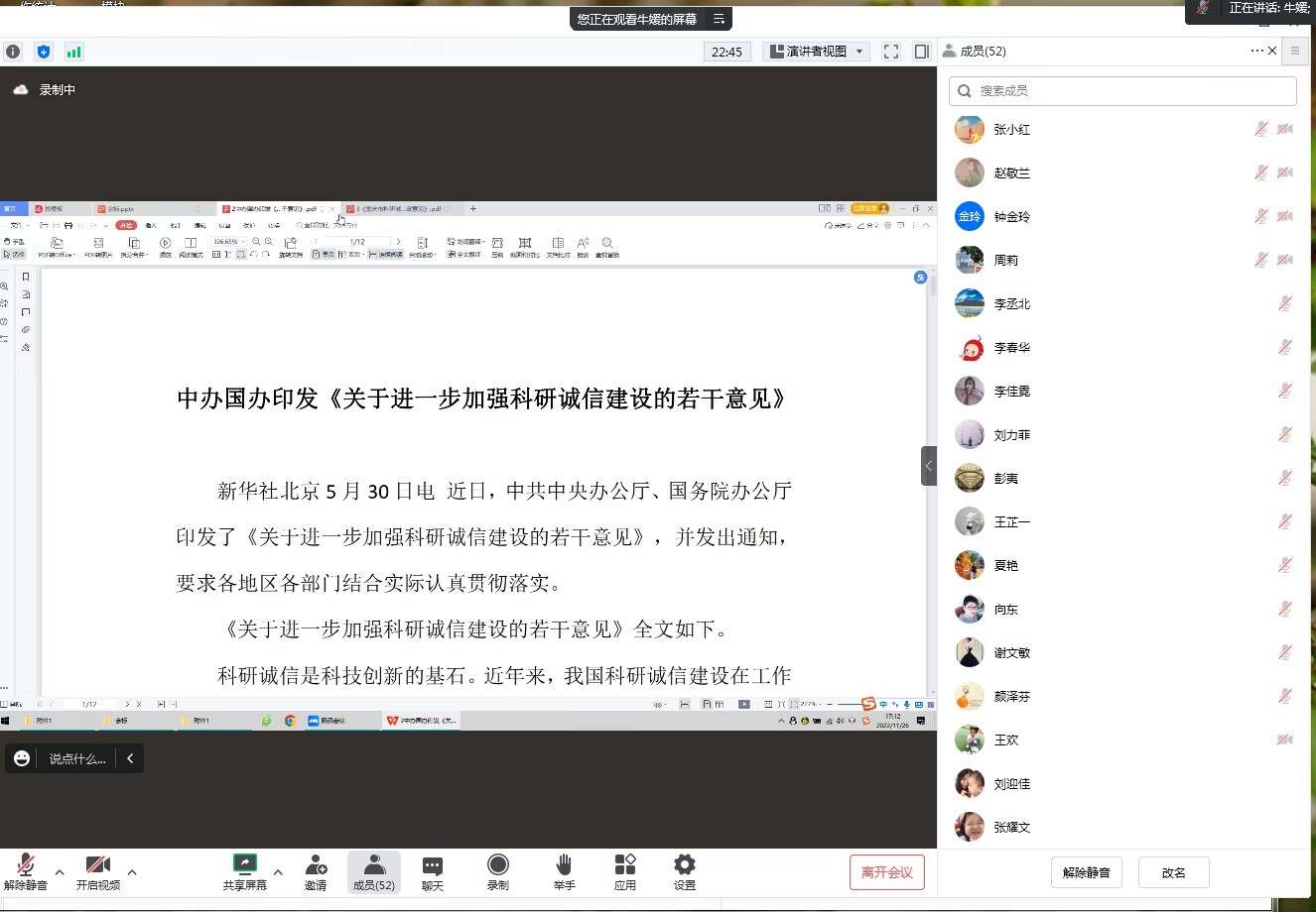 首先,牛媛带领全院教职工共同学习了教育部印发的《高等学校预防与处理学术不端行为办法》、中共中央办公厅、国务院办公厅印发的《关于进一步加强科研诚信建设的若干意见》以及《科研失信行为调查处理规则》(国科发监〔2022〕221号)等科研诚信建设和学术不端相关文件。强调了诚信在科研中的重要性,积极引导全体教师共同营造良好的科研氛围。