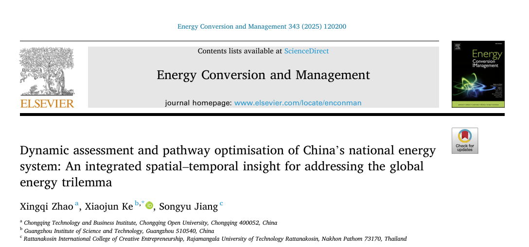 【供稿\米英杰】近日,会计与金融学院赵星琦博士以第一作者身份在国际权威期刊《Energy Conversion and Management》(SCI,中科院一区)发表了最新研究成果:Dynamic assessment and pathway optimisation of China’s national energy system: An integrated spatial–temporal insight for addressing the global energy trilemma(http://dx.doi.org/10.2139/ssrn.4963889),论文聚焦于中国新型能源体系的构建与全球能源“不可能三角”的突破。
