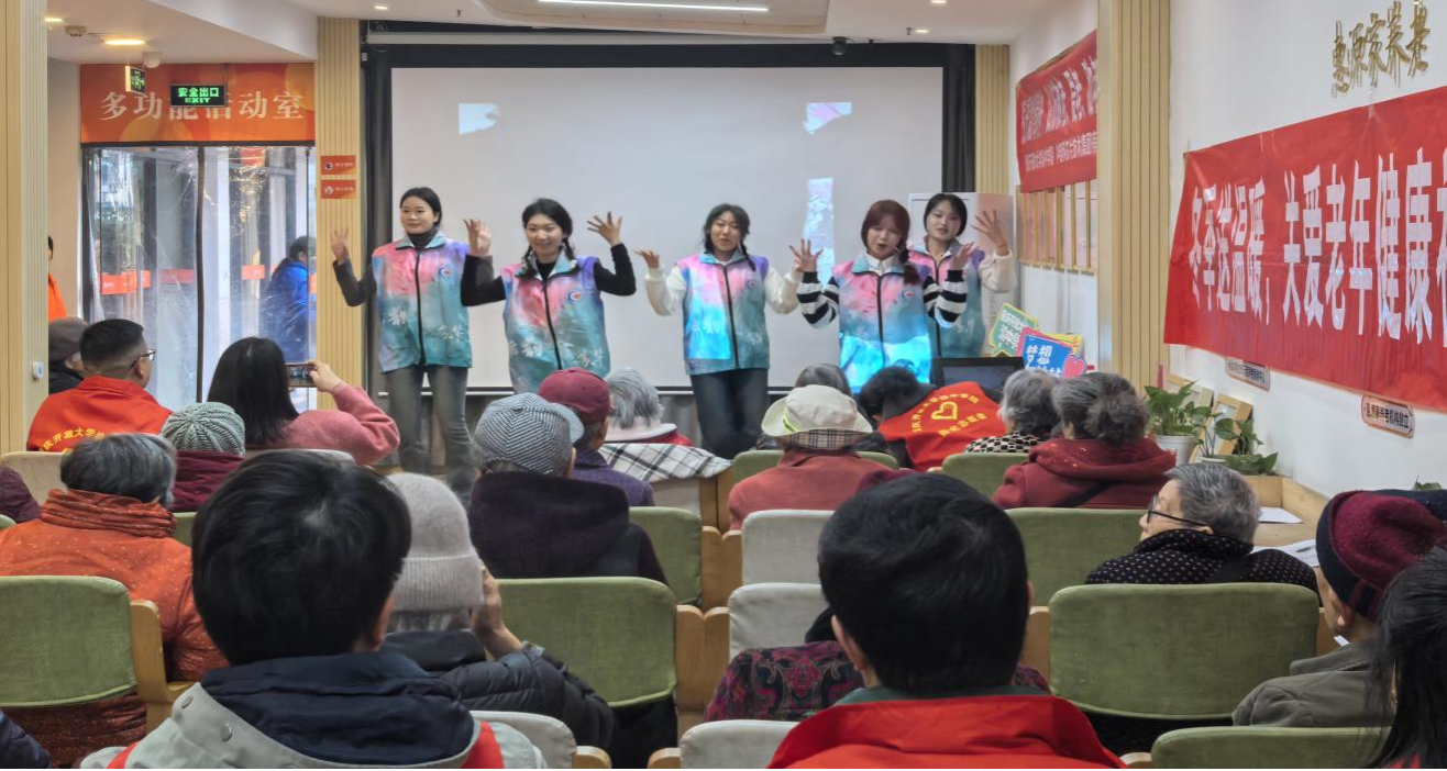 活动伊始,重庆开放大学渝中学院书记余晴致开幕辞,传递对老年群体的深切关怀。随后,由重庆开放大学重庆工商职业学院会计与金融学院学生党员精心编排的舞蹈《桃花朵朵开》温情上演,轻盈的舞步、明快的旋律瞬间点燃现场气氛。