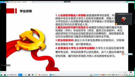 【供稿人/王常兵】为宣传国家征兵政策,鼓励热血青年学子应征入伍,报效祖国。11月21日晚上7点,会计与金融学院在腾讯会议开展毕业生征兵政策宣讲会,由学校退役军人工作站刘洋主讲,2022届毕业生线上参会。