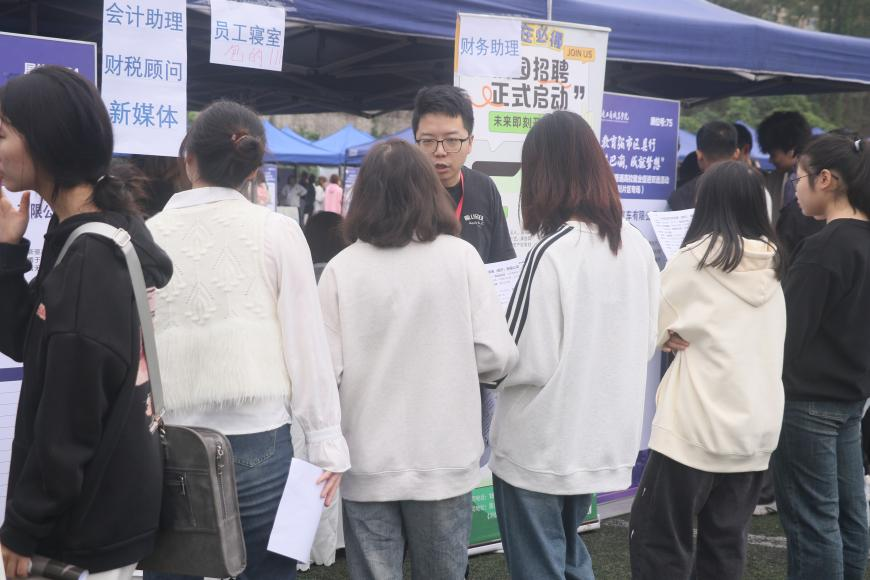 本场双选活动共邀请来自重庆、江苏、广东、山东等12个省市的207家用人单位参会,会计与金融学院邀请46家用人单位,提供就业岗位1500余个。双选会现场,各用人单位热情地向毕业生介绍公司情况、岗位信息以及发展前景等。毕业生们手持精心准备的简历,穿梭在各个展位之间,眼神中透露出对未来职业生涯的期待与紧张。他们积极地与用人单位沟通,了解岗位职责、薪资待遇、晋升机制等关键问题。