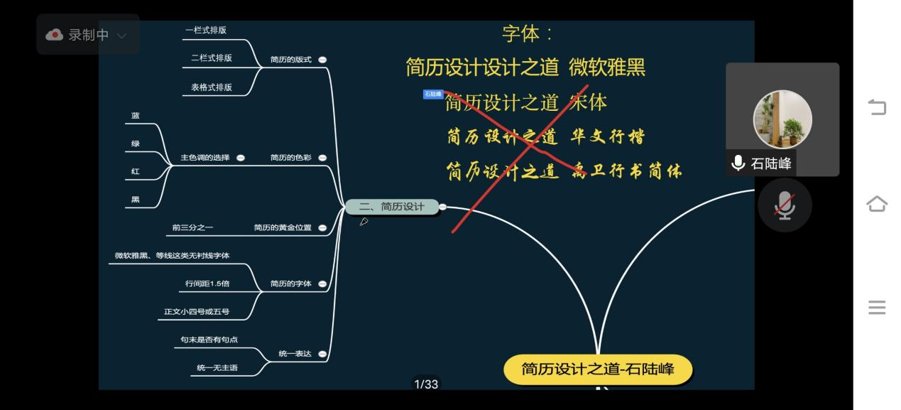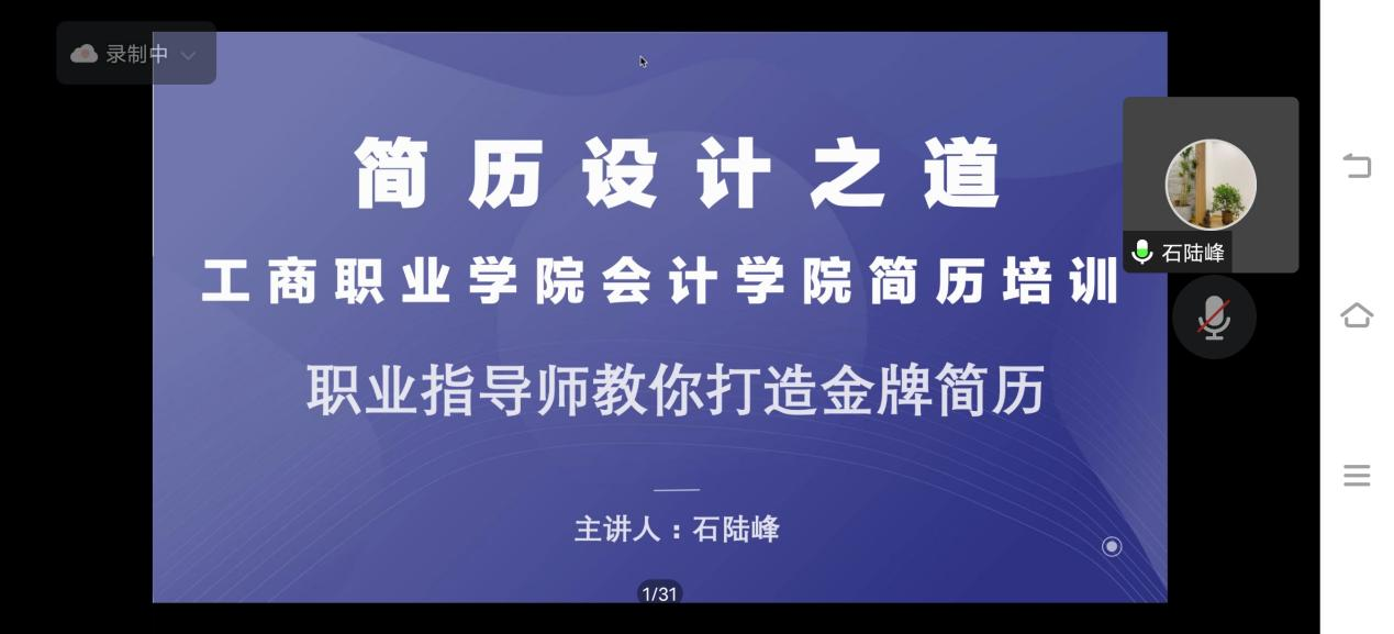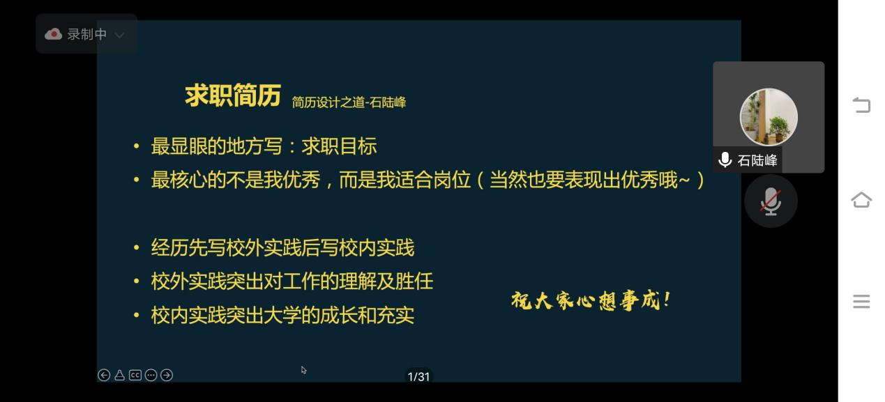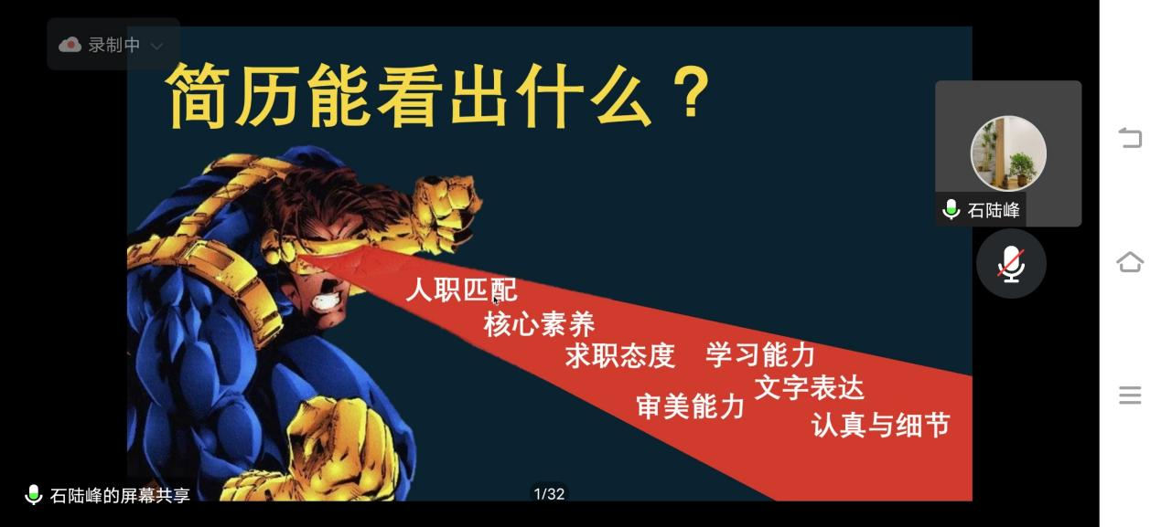 【供稿人:王常兵】为了让我院学生更好地掌握简历制作技巧,提高求职竞争力,拿到自己心仪的OFFER。2022年11月12日晚7点半在腾讯会议举办了“简”字如面,“职”等你来——简历设计专题讲座。本次活动由iCDA国际生涯规划师石陆锋老师主讲,300名学生线上参会。