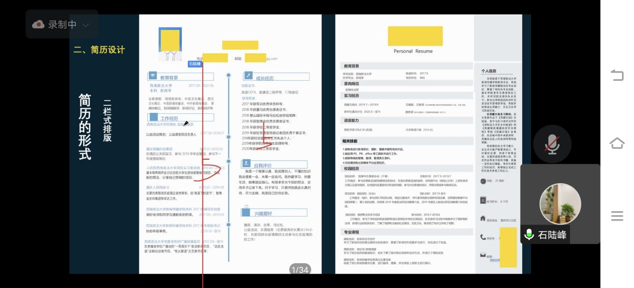 在简制作方面,石陆锋老师从简历的构成、简历设计、简历的原则、简历的疑问、简历的提交等5个方面进行讲解,并辅以优秀简历案例进行详细剖析,清晰、直观地让同学们对一份优秀简历的要求有了更深的了解。此外,石陆锋老师还提醒大家在简历设计中要突出个人优势、扬长避短,避免无针对性的罗列信息。