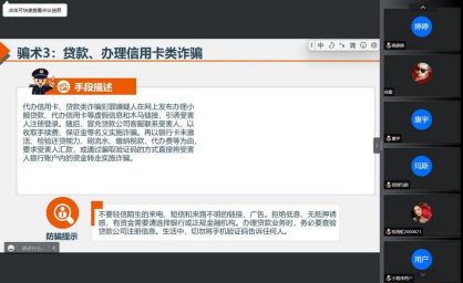各班利用PPT讲解与视频宣传和说案明理相结合的形式面向全体学生进行宣传教育。讲座中通过对合川电信网络诈骗发案数据的展示让学生们关注电信网络诈骗的危害性,通过对电信网络诈骗常见手段的举例与解读,同学们对常见的网评刷单诈骗、婚恋交友诈骗(杀猪盘)、贷款、办理信用卡类诈骗、冒充领导、熟人类诈骗、冒充电商客服诈骗(网购退款诈骗)、虚假网络购物及游戏诈骗等六类常见的电信网络诈骗形式有了更加深入的了解,通过发生在身边的电信网络诈骗案例引导同学们深入学习的预防对策。