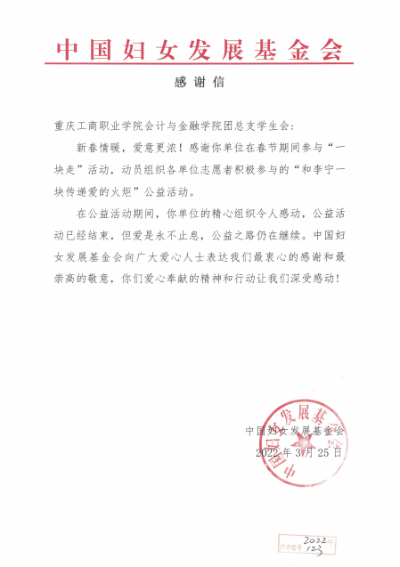公益活动结束后,我院收到中国妇女发展基金会的感谢信。信中对我院团总支学生会组织志愿者积极参与本次公益活动提出了高度肯定和表扬,对我院在培养学生的社会道德素养和爱心奉献精神所做的教育工作点赞。