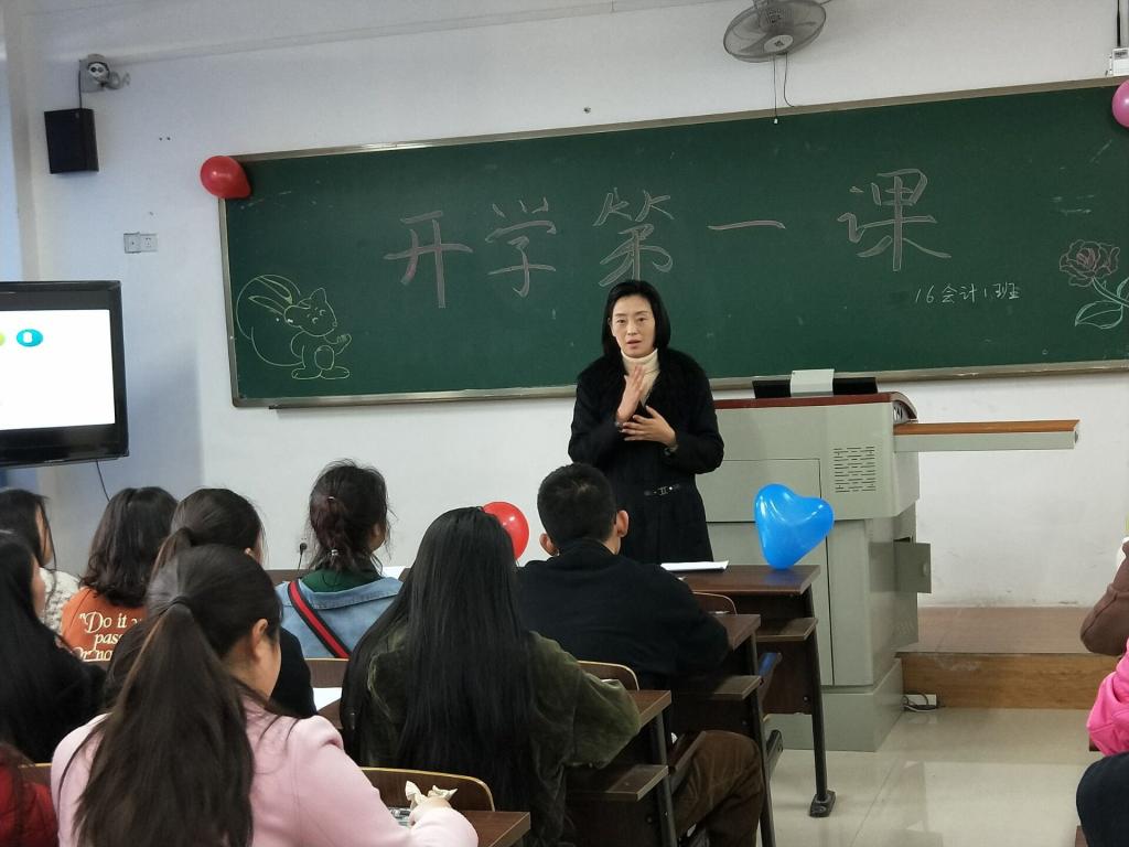 会计与金融学院副院长方华走进16级会计1班的以"为梦前行,找到奋斗源动力"为主题的开学第一课。方华通过两个小故事,告诫大家做事要有方向,一鼓作气达成目标,并且鼓励大家写下自己的目标和具体实施规划。