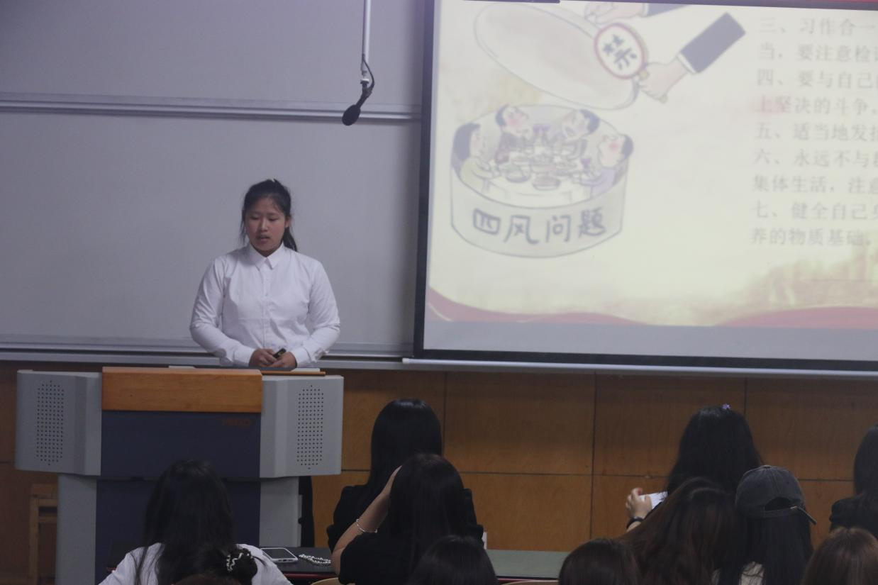 第二位主讲人唐璇同学讲述的是《清风正气,坚守清正廉洁之道》,周恩来同志的一生廉洁奉公,始终保持和发扬了党的艰苦奋斗,艰苦朴素的优良传统和作风。身为当代新青年的我们也应该做到廉洁自律,忠于自己的理想信念,让廉洁文化融入到生活、学习中和工作中。