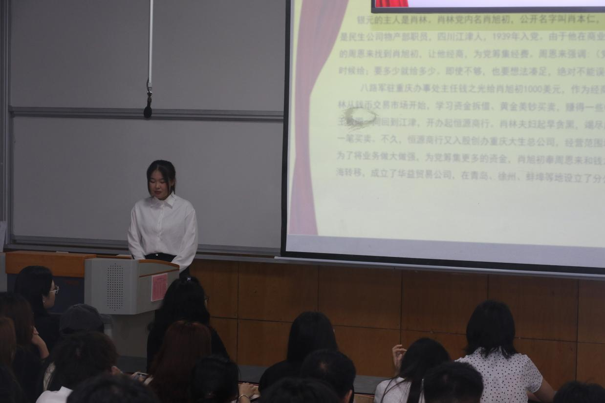 第一位主讲人秦诗涵分享的是《三块银元的故事》,一位无私奉献、始终将党组织交代的任务放在第一位的革命奋斗家—肖林,他听党安排下海经商,成立的公司成为当时地下党的“秘密金库”,公司宣告撤销时共计向中共中央上交的资金约合黄金12万两其他固定资产折价1000多万美元,夫妇二人将三块银元留作纪念,他们常说,党的财产一分一厘也不能挪用。他们用实际行动完美诠释了什么是“忠诚干净担当”,他们的奋斗精神与无私奉献值得我们永远学习。