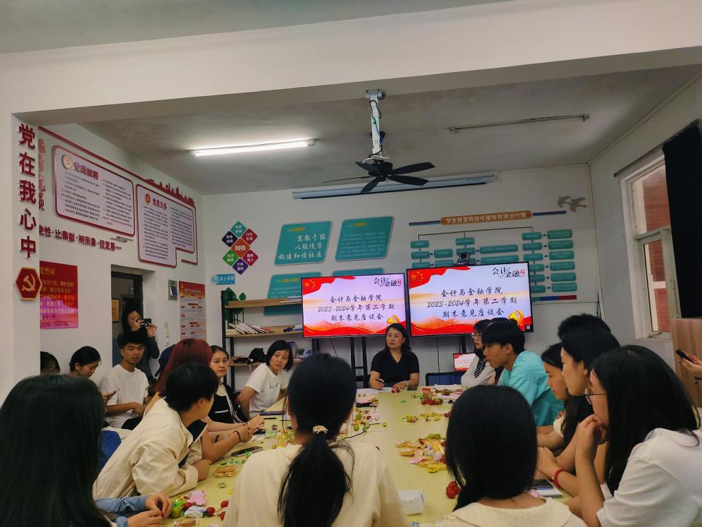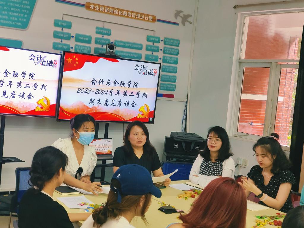 为了解学生思想动态、聚焦学生实际需求、进一步拓宽与学生沟通渠道,会计与金融学院于6月26日下午四点在三号楼网格会议室开展2023~2024学年第二学期期末意见座谈会,此次座谈会邀请到了会计与金融学院党总支副书记刘茂玲,大一辅导员老师们,教务科周琴老师,社区辅导员邹念老师,以及2023级学生代表36人参加此次座谈会。
