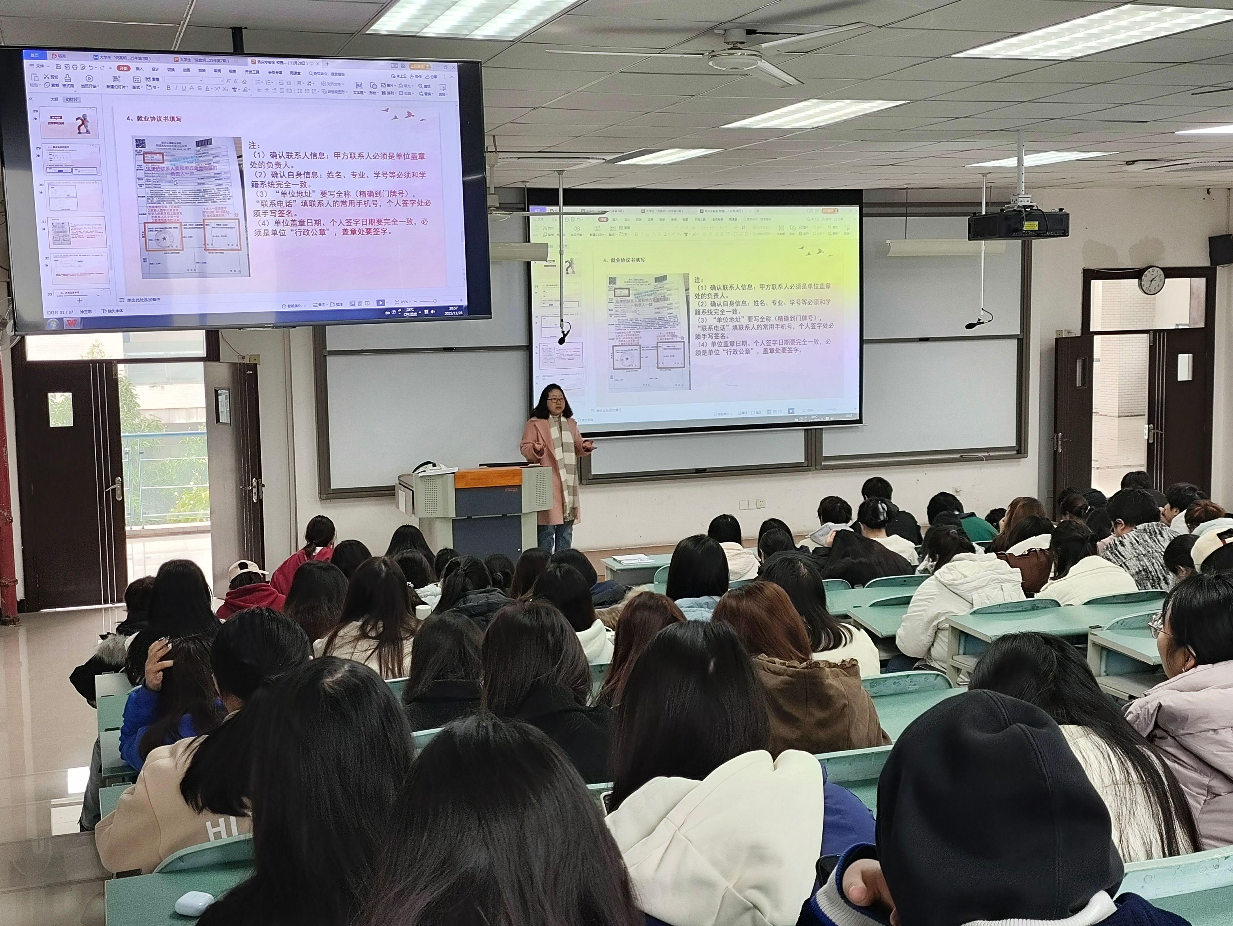 辅导员们围绕实习安全注意事项、就业技能提升、职业心态转变及后期配合学校完成相关调查问卷等关键事项,为同学们进行了细致深入的讲解,并逐一明确了实习期间的各项联系人,确保信息渠道畅通、支持保障到位。辅导员们再三叮嘱,实习期间务必定期关注群通知,按时参加线上班会,完成线上打卡登记,与学院、老师保持密切联系。