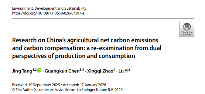 【供稿:米英杰】近日,会计与金融学院唐菁博士等合作完成的研究成果在国际重要学术期刊《Environment, Development and Sustainability》(SCI,中科院3区)正式发表。论文题为Research on China’s agricultural net carbon emissions and carbon compensation: a re-examination from dual perspectives of production and consumption(DOI:10.1007/s10668-026-07397-z)。该研究围绕中国农业净碳排放与农业碳补偿问题展开,从生产与消费双重视角对农业领域碳责任分配与区域补偿机制进行了系统分析,为推动农业绿色低碳转型、完善农业生态补偿制度提供了新的研究思路和实证依据。