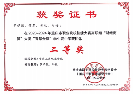 罗正媛、牛媛老师指导学生参加2023-2024重庆职业院校技能大赛“智慧金融”赛项获二等奖